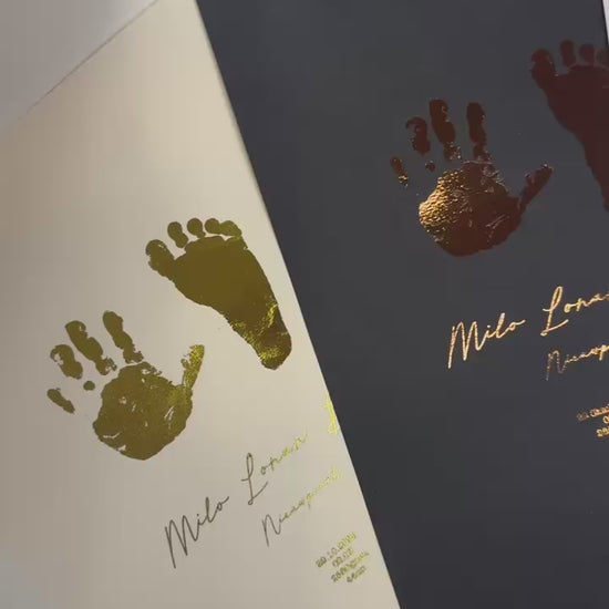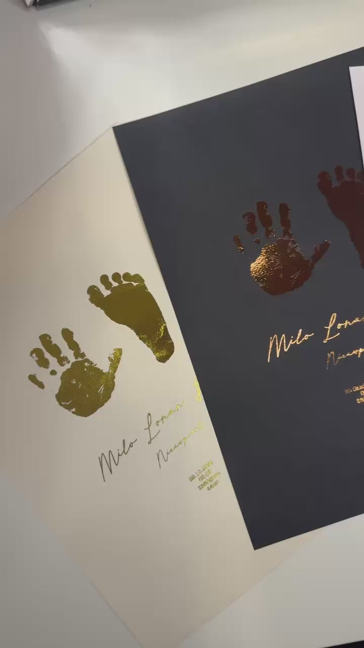 Je kunt kiezen uit een handafdruk, voetafdruk of allebei. De naam, geboortedatum en het gewicht van de baby worden met zorg in gouden, bronze of zilveren folie gedrukt op hoogwaardig papier in wit, gebroken wit, zwart of blauw.